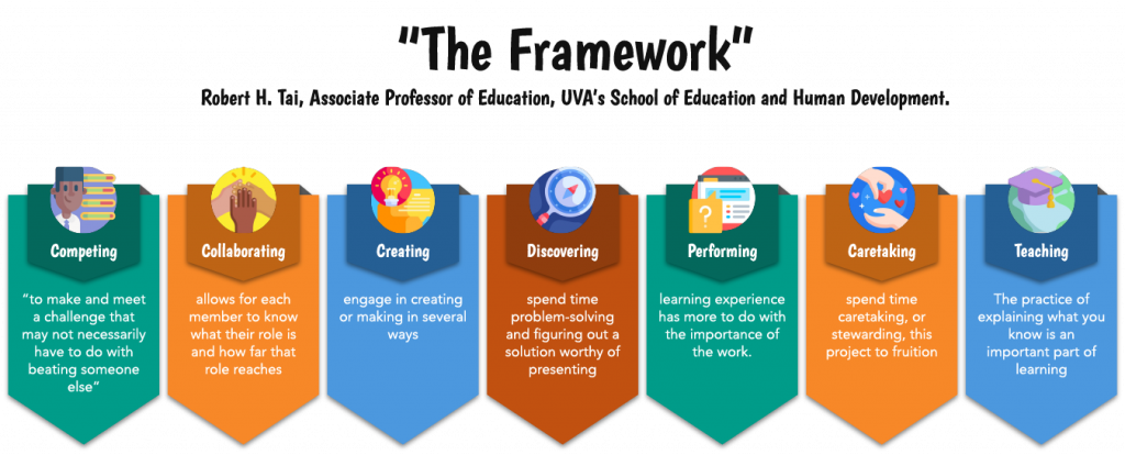 Build upon students’ foundation of Science with problem-based projects. Following The Framework (Robert H. Tai, Associate Professor of Education, UVA’s School of Education and Human Development), from identifying problems to designing solutions, we motivate students to practice ownership and stewardship while applying their Science and Engineering knowledge to bring their projects to fruition.
